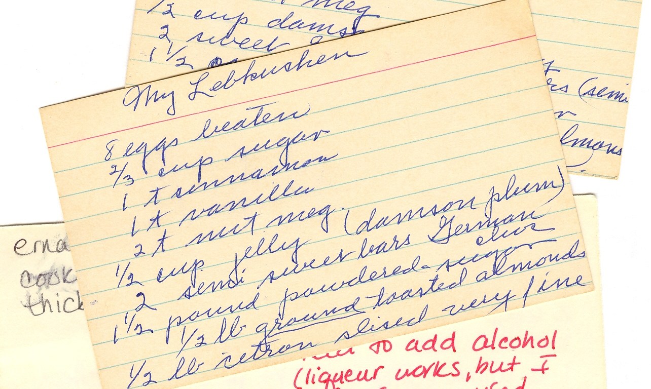 The recipe card in Grammy’s handwriting says “My Lebkuchen,” but there are some obvious ingredients missing, and she lists 8 cups of flour twice. Yikes. The Lebkuchen I recipe is probably closer to what Grammy really used; there’s no question that her best versions contained almonds and a wee drop of spirits. Godiva chocolate liqueur works pretty well, but doesn’t give quite the kick of the Jim Beam Grandaddy kept hidden under the kitchen sink.