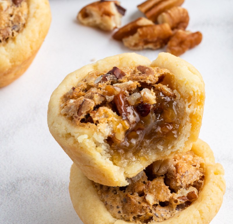 Preheat oven to 325 degrees. Beat together egg, brown sugar, 1 tablespoon of butter, vanilla and salt until smooth. Divide pecans in half. Fill pastry cups with half the pecans; then dollop the sugar mixture over the nuts. Top with remaining nuts. (If you want to just mix the sugar mixture with the nuts and fill the cups all at once, we won’t be in the least troubled.)